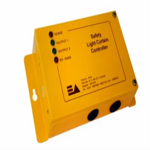This safety light curtain controller manages safety zones. It detects opaque objects to ensure operational safety. Ideal for industrial automation applications requiring reliable protection.
