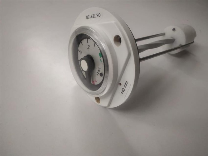 Mechanical fuel level sensor for gensets with a 140mm probe length and white plastic housing. Packaged in a box for convenient storage and transport. Designed for reliable fuel monitoring in generator applications.