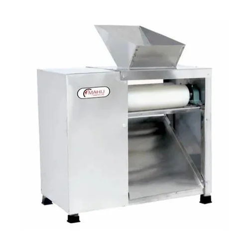 Semi-automatic stainless steel samosa sheeter machine. Produces 150 pieces/hr. 1 HP motor, 12-inch roll, adjustable thickness (0.75-8mm).