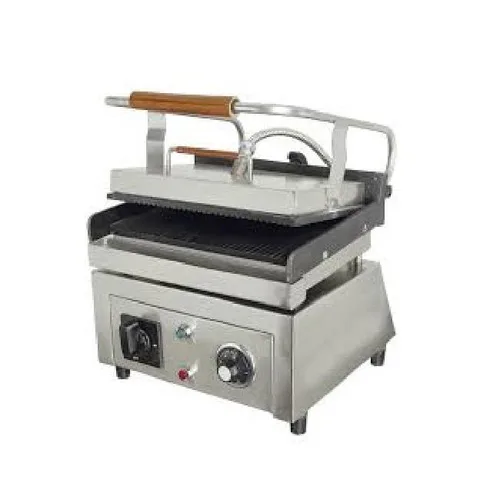 Electric sandwich griller for preparing various sandwiches. Features non-stick plates for easy cleaning. Compact design, suitable for home use. Fast heating for quick meal preparation.