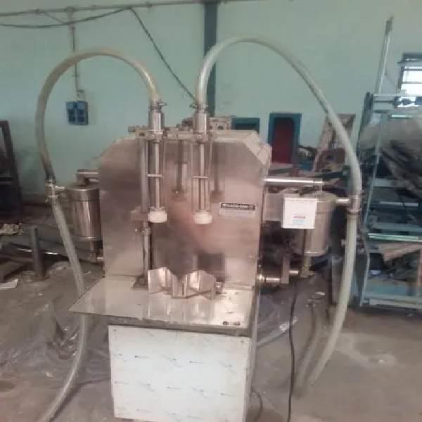 Hydraulic-driven sanitizer bottle filling machine for industrial use. Fills 0-500 pouches per hour. Operates on 220V power. Designed for liquid packaging.