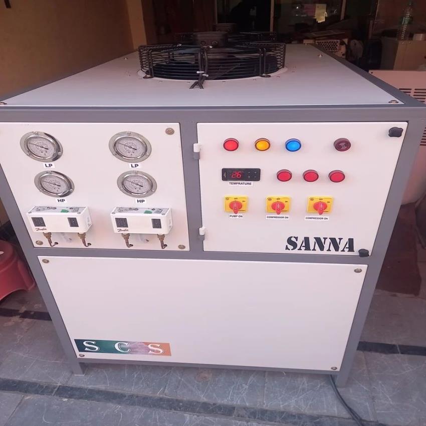 Fully automatic, three-phase air-cooled water chiller. Features Copland scroll compressor, 3 kW power, 3 TR cooling, and 380-420V operation. Ideal for RO & Pharma.