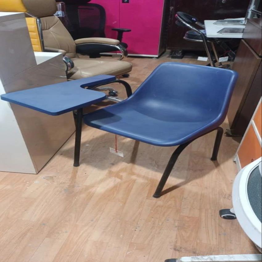 Versatile plastic writing pad chair for schools and coaching. Features a plastic seat and SS frame. Available in many colors, 18-inch width.