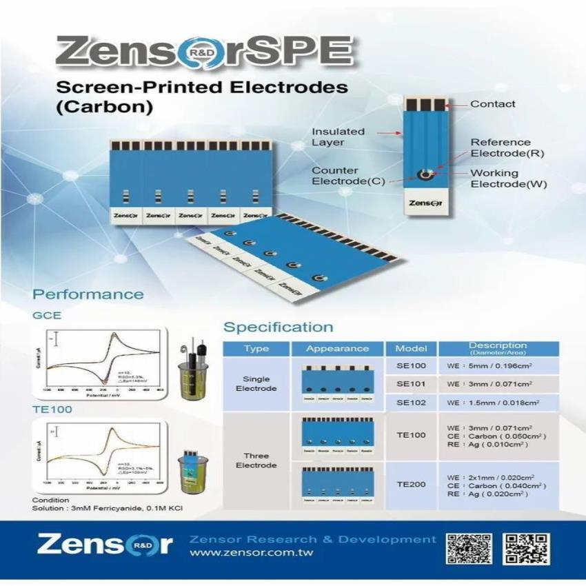 Interdigitated electrodes (SPE) for use with IR, UV, Raman spectrum, NMR, TEM, and microscopy detection. Model numbers include TE100, TE200, TE300, SE100.