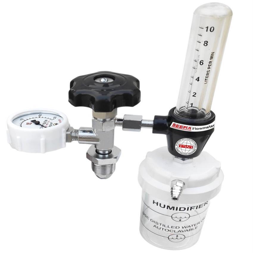 Oxy flow meter with fine adjustment valve and humidifier bottle for precise gas flow control. Suitable for medical or industrial applications.