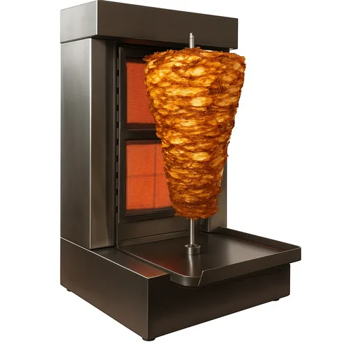 Semi-automatic chicken shawarma machine made of stainless steel. Designed for 0-5 kg meat capacity. Operates on 220V, 50 Hz frequency, suitable for all applications.