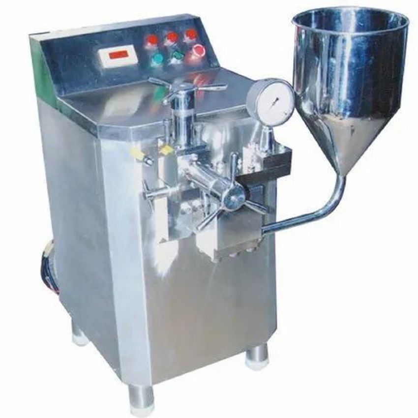Three-phase semi-automatic fruit juice homogenizer equipment powered by electric source. Operates at 220V AC, 50 Hz, with a 1-year warranty.