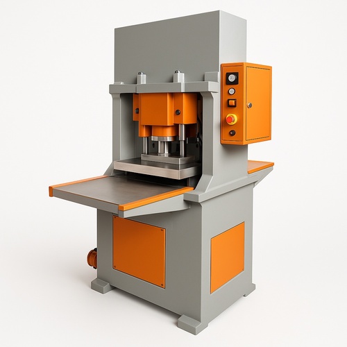 Semi-automatic blister cutting equipment with hydraulically operated tray. Features auto die setting, 100-150 tons capacity, 6kW power, and 800-1200 sq mm working area.