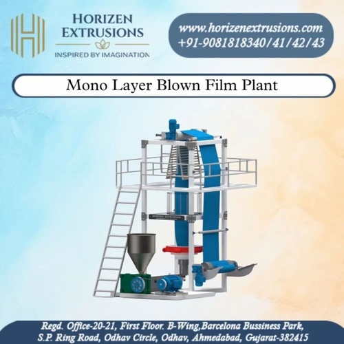 Semi Automatic Blown Film Machine. Handles various materials including steel. Operates on 220-440V, 3 phase. Max extrusion output 80 Kg/Hr, film thickness 20-75 Micron.