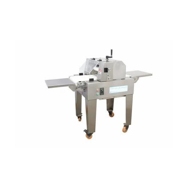 This semi-automatic horizontal cake slicing machine, made of SS 304, is electrically powered. It operates on 220-380V, 50 Hz, and is suitable for cutting cake, buns, and bread.