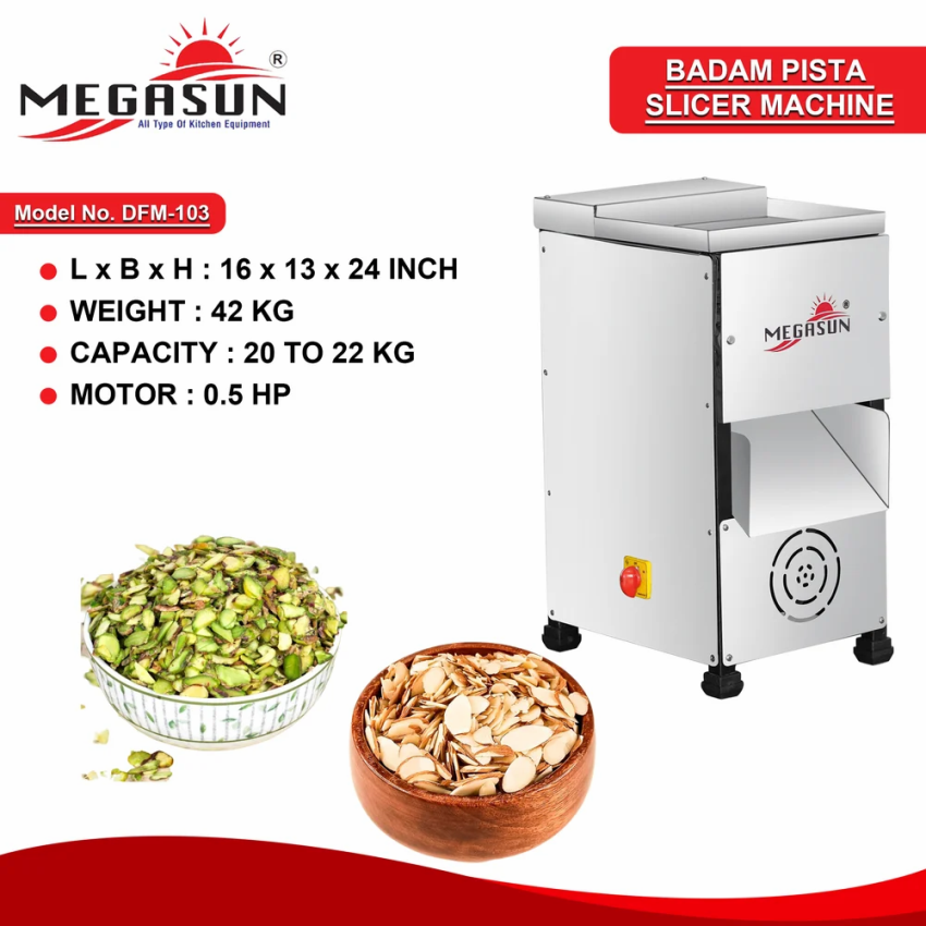 Semi-automatic SS nut slicer machine with 0.5 HP motor. Capacity up to 50 kg/hr. Polished stainless steel construction for kitchen use.