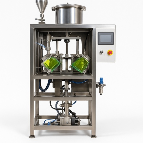 Semi-automatic stainless steel perfume filling machine. Fills 10ml-1000ml with +/-2% accuracy. Operates on 230V, 50Hz, single-phase electric power.