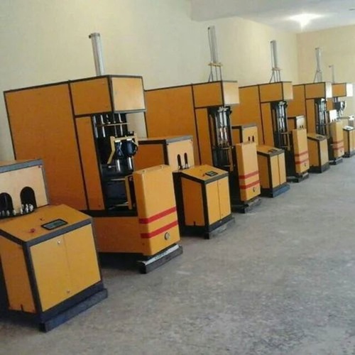 This semi-automatic PET blowing machine produces bottles from 1-5 litres using PE material. Features 2 cavity mould, electric power, and 50 Hz frequency. Made in India.