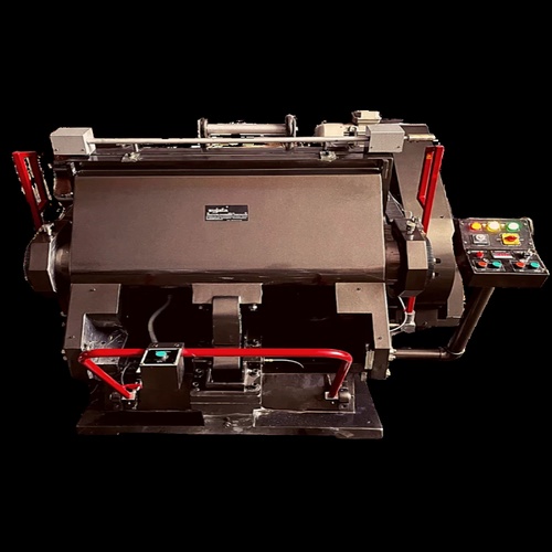 Industrial cast iron platen die cutting machine, semi-automatic. Features 190-ton pressure, 3hp power, 22x32 inch inside chase, and 25x35 inch platen size. Weighs 3700kg.