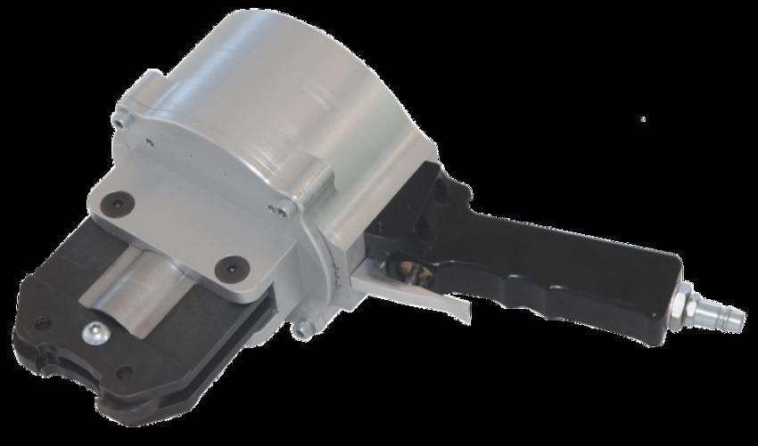 Semi-automatic pneumatic steel strapping sealer (Model ITI45) weighing 2.9 Kgs. Features single notch sealing, joint strength of 80%, and accepts steel straps from 0.6-1.0 mm.