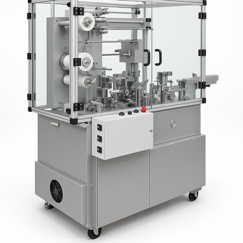 Semi-automatic PVC overwrapping machine with PLC control. Handles format ranges from 60x60x20mm to 60x60x20mm. Achieves 30-40 cycles per minute. Made in India.