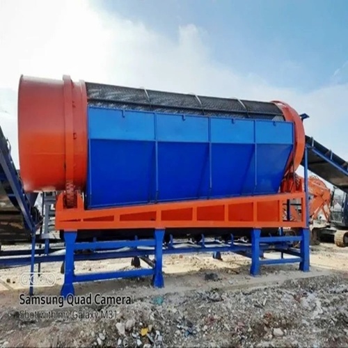 Semi-automatic screening machine with conveyor for municipal waste processing. Offers over 5000 kg/hr capacity. New condition with installation service available.