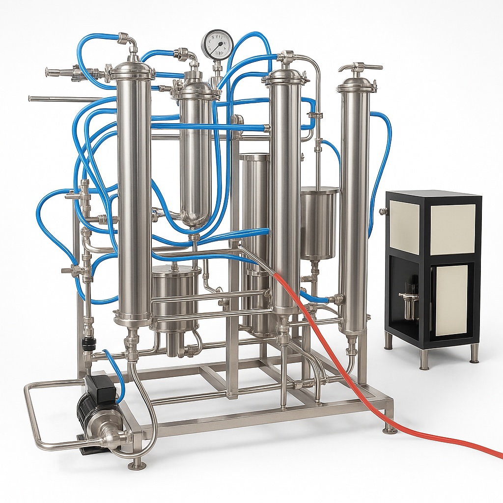 Semi-automatic shell-in-tube juice pasteurizer machine. This 2-stage unit offers a 200 LPH capacity and requires 80Kw power, suitable for all juice types.