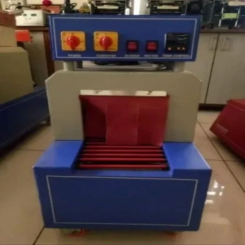Semi-automatic shrink wrapping machine for bottles. Features 1 HP blower, 3-phase, 415V power, and stainless steel construction for high-speed operations.