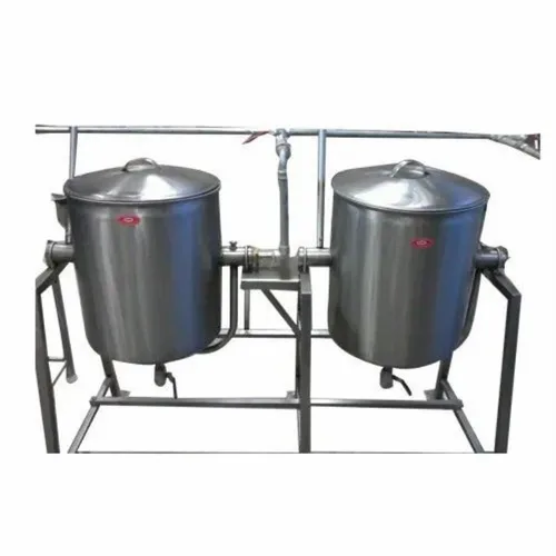 100-liter capacity semi-automatic stainless steel cooking vessel, vertical orientation. Made in India.