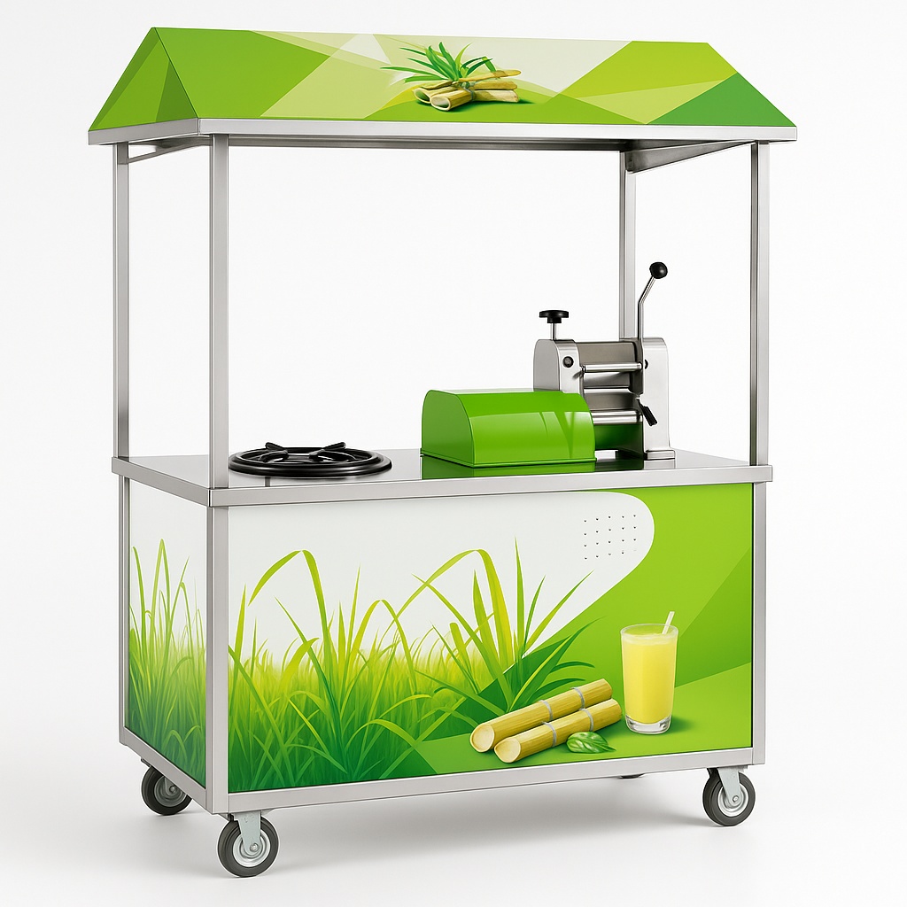 Semi-automatic sugarcane processing trolley with 1 HP motor and 3 stainless steel rollers. Processes 120KG/HOUR, yielding 400 ml/kg. Electric powered for efficiency.