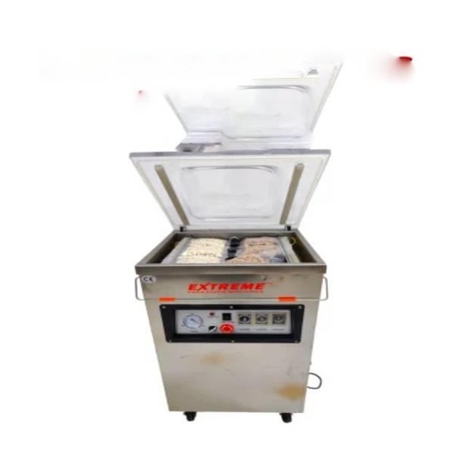 Semi-automatic vacuum packaging machine, model designation 'Vacuum Packaging Machine'. Operates on 240V, made of mild steel in India, suitable for commercial use with black ink.
