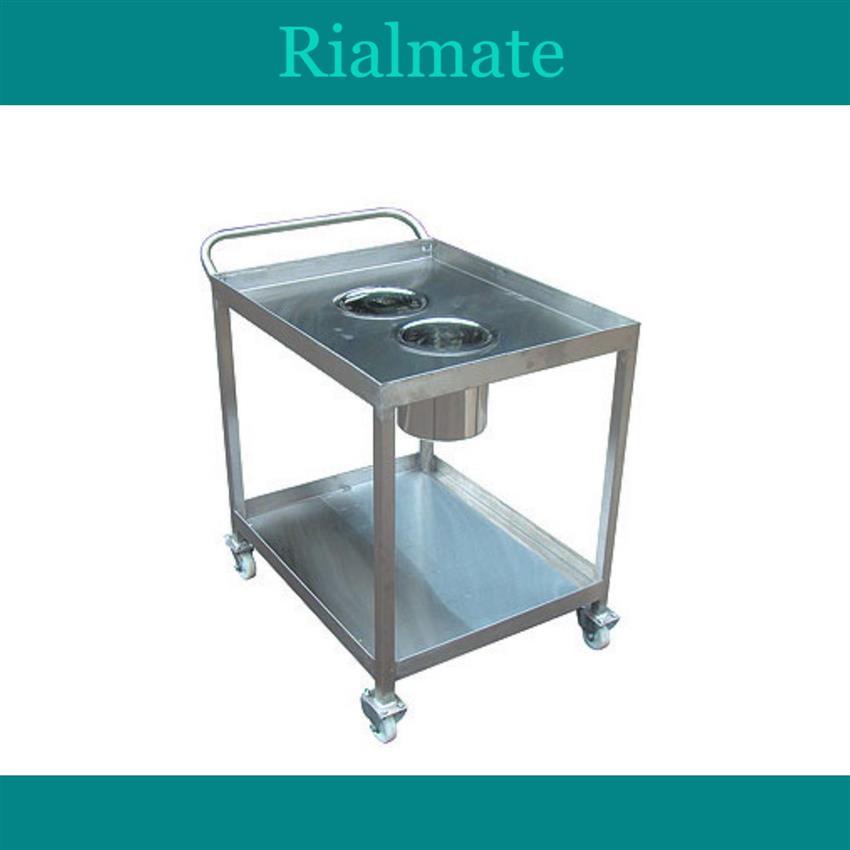 Durable stainless steel serving trolley with 100kg capacity. Features 2 layers and 2 containers for efficient service. Equipped with 4 wheels for easy maneuverability. Silver finish.