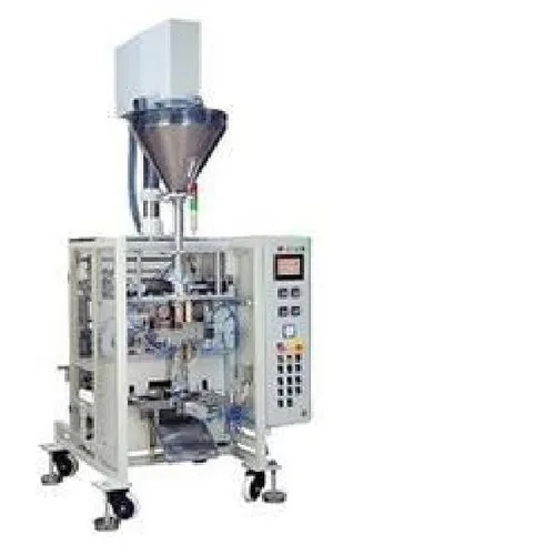 Pneumatic collar type servo auger filler for industrial use. Features mild steel construction with SS contact parts. Fills 25-50 BPM, suitable for plastic and laminated pouches.