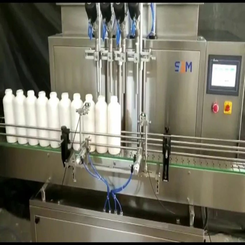 4-head servo liquid filling machine with pneumatic shut-off nozzle and 200L buffer tank. Fills 50ml-1000ml at up to 40 bottles/minute. Features HMI control.