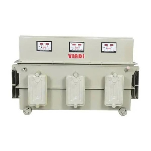 Automatic three phase servo voltage stabilizer machine with oil cooling. Rated capacity: 50 KVA. Operates between 0-55°C with low no-load loss of 0.25%. Grey color.