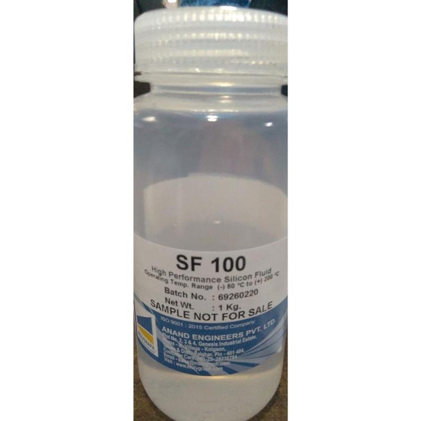 SF 100 silicone fluid for industrial use. Features 100% silicone content, viscosity of 100 cSt at 25°C, and an operating temperature range of -60°C to +200°C. Supplied in a 1 kg bottle.