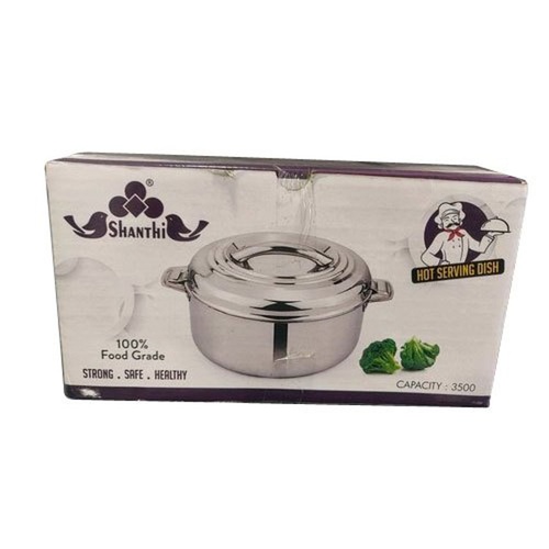 Stainless steel hot case with 3500 ml capacity. Dishwasher safe and 100% food grade. Packaged in a box for home use. Features a round shape and secure closure.