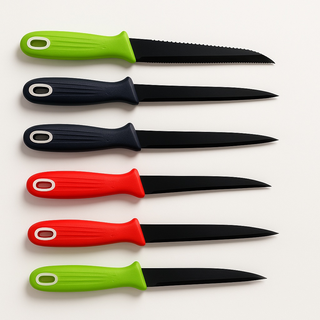 Sharp SS and plastic kitchen knife. Available in green, black, and red with a polished finish.