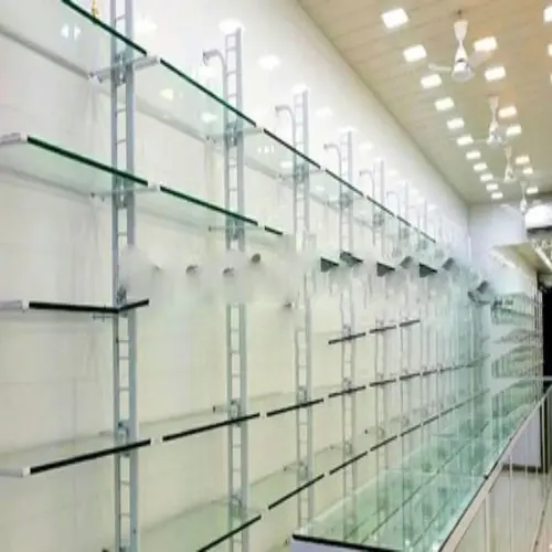 This showroom glass display shelf is manufactured in India, offering a versatile display solution for retail environments. Its design focuses on showcasing merchandise effectively.