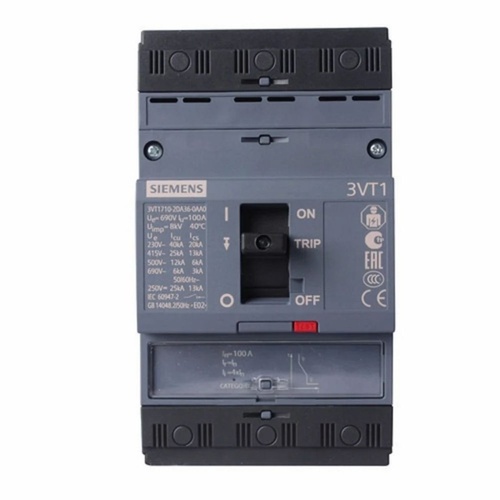 Siemens 3VT series MCCB. Features 630A current rating, 3 poles, 36kA breaking capacity, and automatic switch control for low-voltage industrial applications.