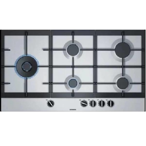 Siemens Iq 500 Hob EC9A5SB90I, 90cm stainless steel hob with 5 burners, step flame technology, and cast iron pan support. Knob control.