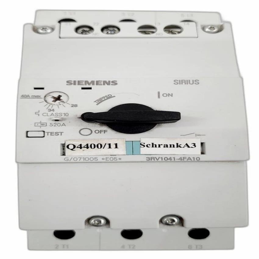 Siemens 3RV1041-4FA10 motor circuit breaker. Features -50 to +80 Deg C ambient temperature, 6,000 V impulse voltage resistance, and IP20 protection class. Compact design: 70 mm width, 165 mm height, 174 mm depth.