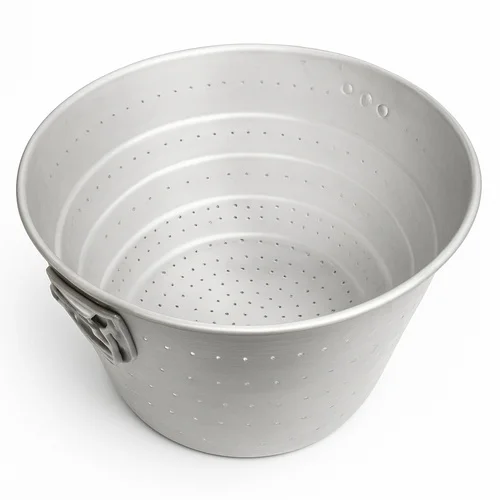 Durable silver aluminium kitchen strainer. Ideal for rinsing rice and draining pasta. Lightweight and easy to clean for efficient food preparation. Measures [insert dimensions if available].