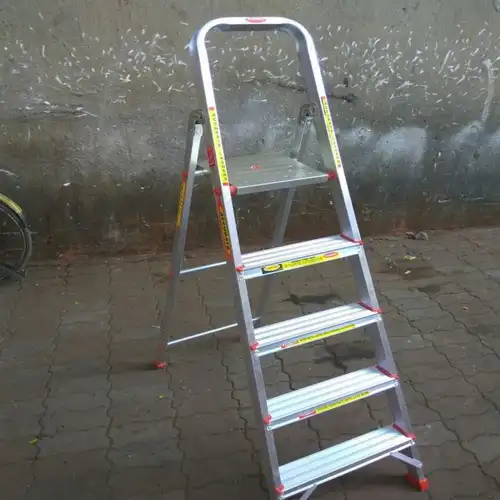 Refurbished silver anodised aluminium step ladder with four steps. Skid-proof fluted mullion design, capacity 200, suitable for various sizes.