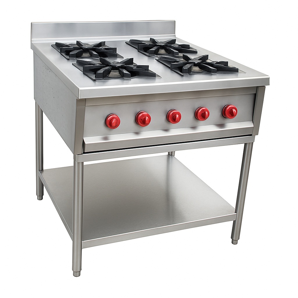 Commercial four-burner LPG range in silver. Constructed from stainless steel, this customised cooking range is ideal for commercial applications, offering a robust and reliable cooking solution.