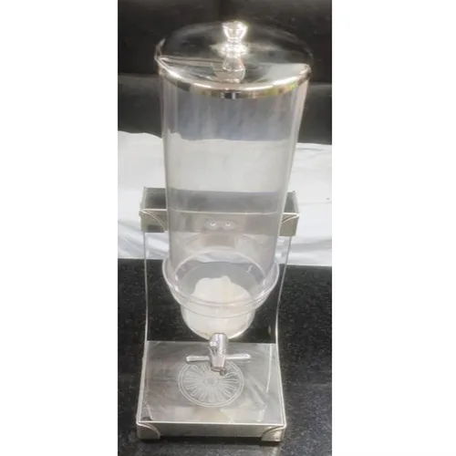 Silver-based manual cereal dispensing machine with SS and glass construction. Capacity of 3.5 Kg. Dimensions: 15.24 x 19.35 x 39.67 cm.