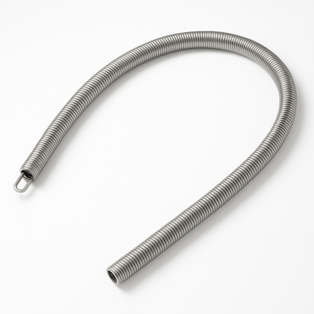 Silver stainless steel bending spring with a polished surface finish. Packaged in a box. Designed for bending applications.