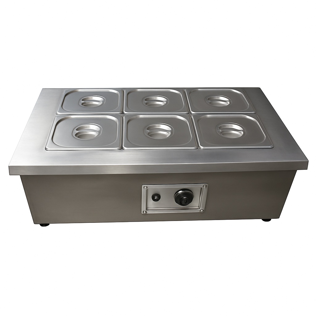 Silver rectangular table top bain marie counter for commercial use. Compact design for countertop placement. Enhances food display and keeps items warm. Suitable for various food service settings.