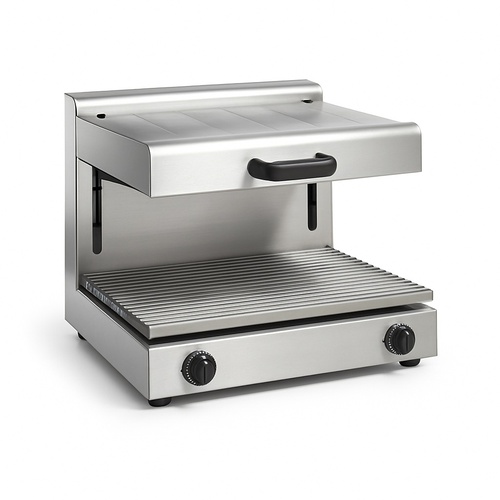 Portable silver electric salamander grill, 24"X22"X12", made of stainless steel. Designed for restaurant use, with a 220kv power output and capacity for 100 plates.
