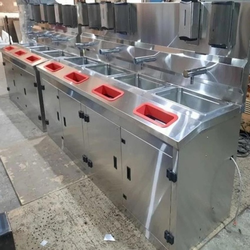 SS 304 construction with matt finish. Features a jet hand dryer and single sink. Dimensions: 900 x 450 x 850 + 600 mm height. Customisable.