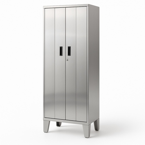 Silver medical storage cabinet made from SS 316 stainless steel. Features 2 hinged doors with a glossy, surface finish. Ideal for medical facility storage.