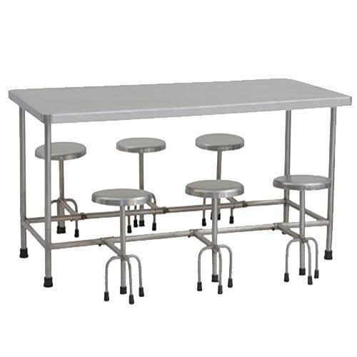 Silver 6 seater dining table made from stainless steel. Features a polished surface finish and a table thickness of 12-15 mm. Durable and stylish for any dining setting.