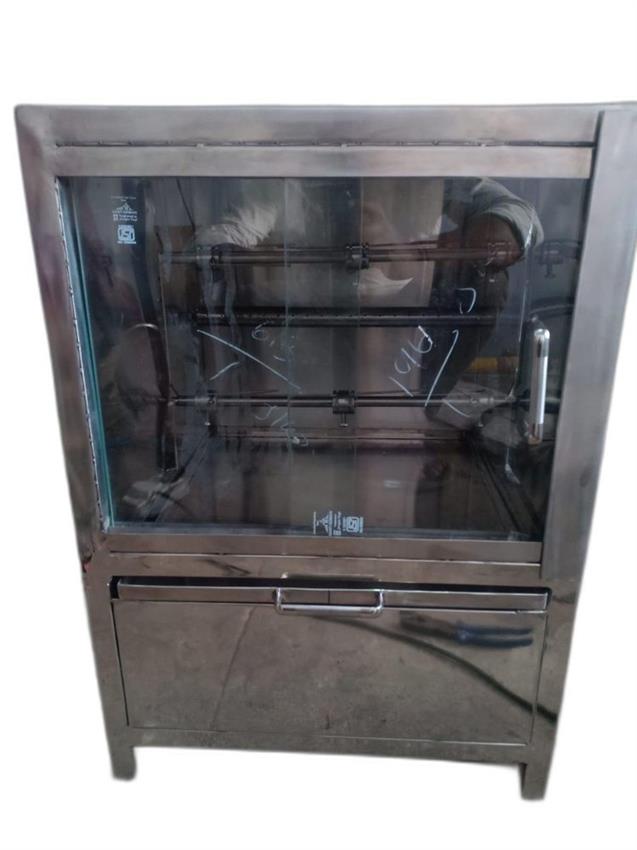 Mini silver stainless steel chicken grill machine for hotel use. Features 6mm glass, 10rpm rotation speed. Gas-powered for efficient grilling.
