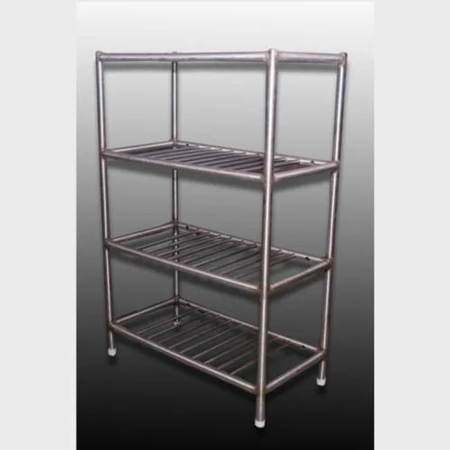 Silver modern stainless steel kitchen rack with 4 shelves. Designed for housing applications, offering durable and stylish kitchen storage.