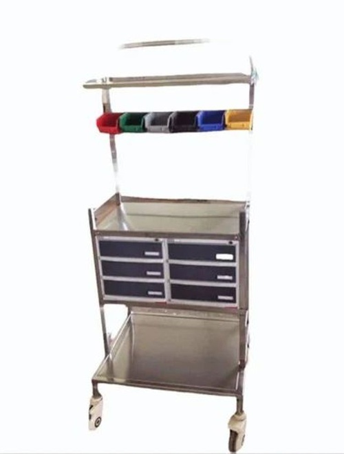 Stainless steel crash cart trolley. Silver color with a steel finish. Size is stranded. Ideal for medical use. Minimum order quantity: 01.